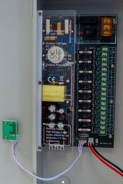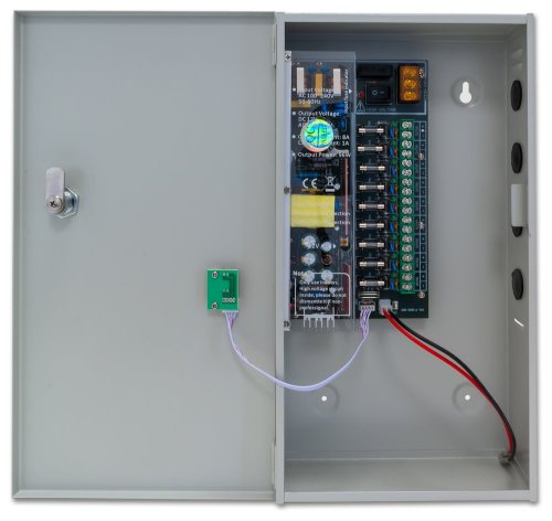 Stabilizovaný napájecí zdroj pro devět spotřebičů s okruhem pro nabíjení a připojení záložní baterie. Nastavitelné výstupní napětí DC 12-13 V, každý port max. 1,5 A. Celkový výstupní proud 8 A. Skříňka na zeď s instalovaným PCB, kabelové průchodky. Připojení kabelů k interní svorkovnici. Ochrana proti zkratu přístrojovou pojistkou, ochrana proti přepětí. LED signalizace funkčnosti portů.