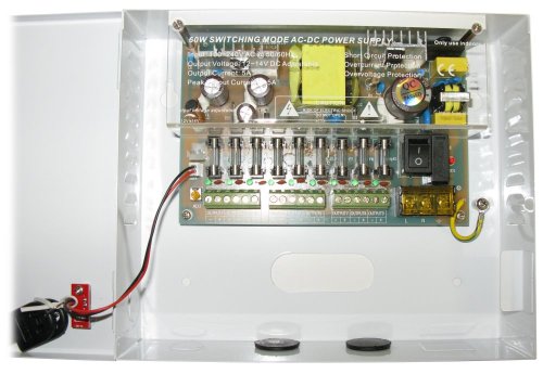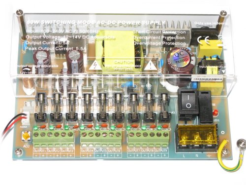 Stabilizovaný napájecí zdroj pro osm spotřebičů, nastavitelné napětí DC 12-14 V, každý port max. 1 A. Celkový výstupní proud 5 A, krátkodobě 7,5 A. Skříňka na zeď s instalovaným PCB, kabelové průchodky. Připojení kabelů k interní svorkovnici. Ochrana proti zkratu přístrojovou pojistkou, ochrana proti přepětí. LED signalizace funkčnosti portů.