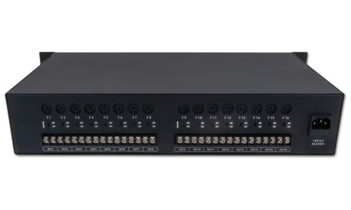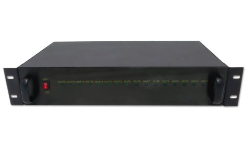 Napájecí zdroj pro instalaci do 19" rozvaděče, 24 V AC, 5 A max., 16× výstup, každý chráněn tavnou pojistkou. Bez pohyblivých částí. Volitelné výstupní napětí 24 V nebo 28 V pro každý port zvlášť na zadním panelu. LED indikátory pro vstupní a výstupní napětí