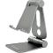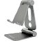 Skládací systém Slitina hliníku Nastavitelná výška a náklon Stolní kovový držák vhodný pro mobilní telefony a tablety do maximální velikosti úhlopříčky 7"". Ideální sklon a výšku nastavíte díky dvěma polohovatelným kloubům. Držák je možné složit do vodorovné polohy vhodné pro přepravu. Zařízení můžete položit na držák v horizontální nebo vertikální poloze. Výřezy na kabely podporují nabíjení zařízení během položení na držák.
