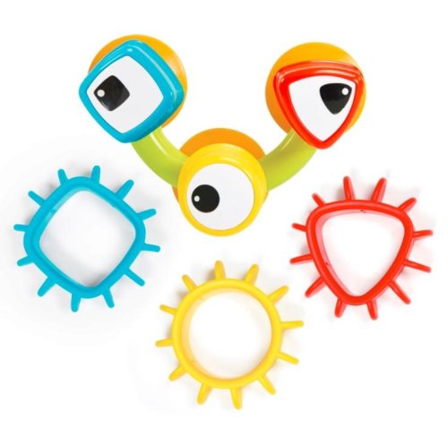 Sestavte převody podle tvarů a barev. Nalitím vody ze zkumavky se roztočí celý mechanismus. Hračka se připevňuje ke stěně vany pomocí přísavek.
