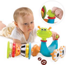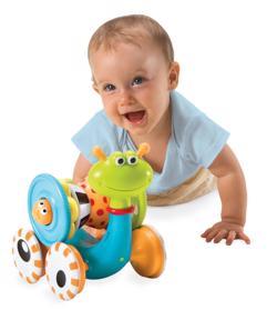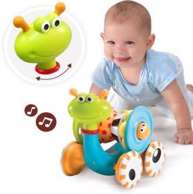 Jezdící šnek s veselou melodií a točící se barevnou ulitou pobízí dítě, aby za ním stále lezlo.