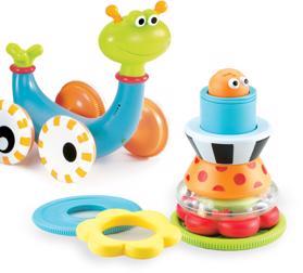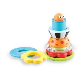 Obsah balení: šnek na kolečkách - skládací díl s chrastítky, korálky a pískací hlavičkou.
