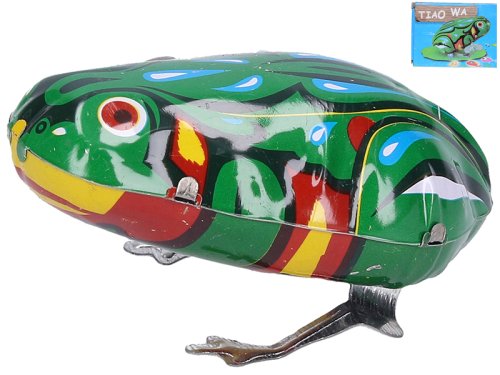 Pohyb plechové žabky zajišťuje pérový strojek natahovaný klíčkem. Rozměry balení 7 x 5 x 4 cm. Vhodné pro děti od 3 let.