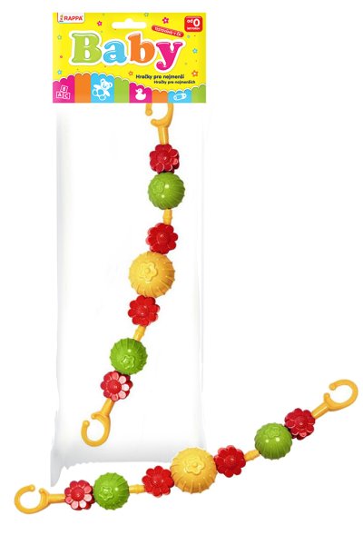 Chrastící zábrana na kočárek s otočnými barevnými kuličkami a kytičkami je určen pro ty nejmenší! Na obou koncích se nachází oka na uchycení ke kočárku. Barvy produktu se mohou lišit od vyobrazení. Tato roztomilá a navíc praktická vecička udělá radost každému děťátku!