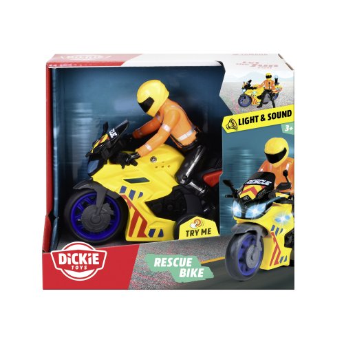 Motorka Yamaha na setrvačník, se světlem a zvukem, s pohyblivou figurkou řidiče. Délka 17 cm.