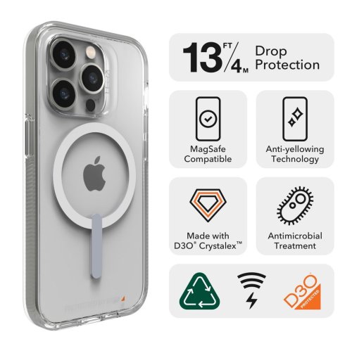 Transparentní kryt kompatibilní se systémem MagSafe vyrobený z materiálu D3O®, díky kterému zařízení ochrání při pádech z výšky až 4 metrů. Jeho povrch je obohacen o antimikrobiální vrstvu. Při výrobě krytu byl použit materiál D3O Crystalex, díky tomu deklaruje ochranu zařízení při pádech z výšky až 4 metrů. Materiál je současně vytvořen tak, aby odolával zežloutnutí a přenosu barev a zůstal křišťálově transparentní.