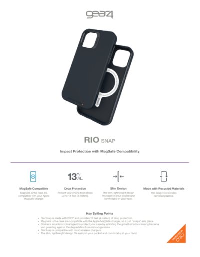Ochranný kryt kompatibilní se systémem Apple MagSafe. Kryt je vyroben z materiálu D3O®, díky kterému vaše zařízení ochrání při pádech z výšky až 4 metrů. Kryt je navíc obohacen o antimikrobiální vrstvu RepelFlex™. Ochranný kryt Gear4 Rio Snap je kompatibilní s MagSafe. Díky zabudovaným magnetům kryt k nabíječkám a ostatnímu příslušenství dokonale přilne, to zajistí stabilní nabíjení a ničím nerušené používání ostatního příslušenství.