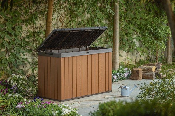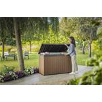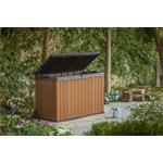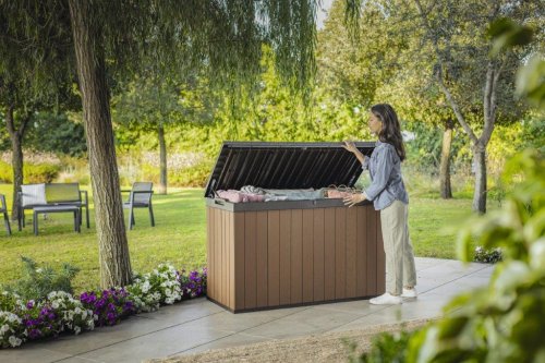 Najděte pro box ideální místo na zahradě. Díky struktuře, která připomíná dřevo, zapadne do každého prostředí. Uložené věci navíc můžete uzamknout uvnitř boxu. Hydraulický pístový systém zajistí plynulé a bezpečné zavírání a otevírání víka. Po zavření se na něj navíc usadí až 2 lidi.