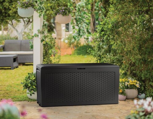 Zahradní box je vyrobený z vysoce kvalitní polypropylenové pryskyřice v moderním designu, který imituje strukturu přírodního ratanu. Skříň je nízká a její dno zvládne unést až 30 kg nákladu a víko vydrží zatížení až 150 kg, takže je ideální i pro skladování podstatně težších věcí. Stěny jsou vyztužené žebrovými segmenty, takže skříň hravě odolá i drsnému zacházení a vandalismu a nevadí ji ani extrémní počasí či UV záření.