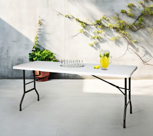 Tento skládací zahradní stůl je ideální volbou pro ty, kdo hledají funkční a snadno skladovatelný nábytek na venkovní použití. Je dostatečně pevný pro každodenní použití a nabízí pohodlí při přípravě venkovního stolování.