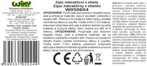 Zajíc interaktivní s efekty. Velikost 18 cm. 2xAA baterie součástí balení. Vydává světelné a zvukové efekty. Aktivace tlačítky na bříšku. Funkce automatického vypnutí. Přepínač na vypnutí a dvě úrovně hlasitosti.