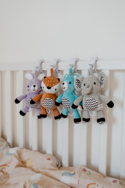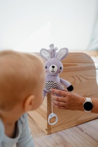 Roztomilý plyšový zajíček s natahovacím hracím strojkem je ideálním společníkem pro miminka již od narození. Stačí zatáhnout a hračka začne přehrávat uklidňující melodii, která pomáhá děťátku zklidnit se a snadněji usnout. Díky praktickému závěsnému klipu lze hračku snadno připevnit na kočárek, postýlku, autosedačku nebo hrazdičku. Miminko tak bude mít svého hebkého kamaráda vždy u sebe – doma i na cestách. Zajíček je vyroben z měkkého a příjemného plyše, který miminka přímo vybízí k mazlení. Jemné pastelové provedení a kontrastní vzory podporují vizuální vnímání malých dětí, má také jemně šustící uši. Hračka je certifikována v ČR, takže splňuje přísné bezpečnostní normy pro děti od 0 měsíců.