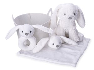Zajíček plyšový 20 cm bílý sedící s chrastítkem 13 cm a usínáčkem v košíku
