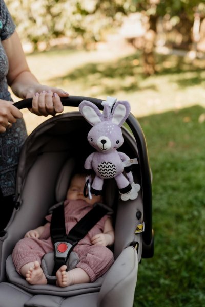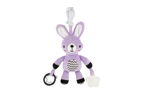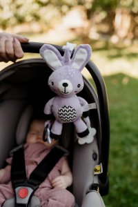 Roztomilý plyšový zajíček je ideální hračka pro miminka již od narození. Díky praktickému závěsnému klipu jej snadno připevníte na kočárek, autosedačku, postýlku nebo hrazdičku, takže bude mít miminko svého kamaráda vždy nablízku. Hračka je vyrobena z měkkého a příjemného plyše, který láká k mazlení. Má jemné chrastící uši, podporuje sluchové vnímání dítěte. Na konci ručiček jsou umístěny bezpečné plastové tvary (hvězdička a kytička), které děťátko zaujmou, pomohou rozvíjet jemnou motoriku a slouží i jako hračka na žužlání. Zajíček je certifikován v ČR, takže splňuje vysoké bezpečnostní požadavky pro děti od 0 měsíců.