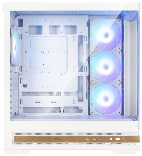 Elegantní počítačová skříň nabízí prosklenou bočnici i přední panel, prvotřídní kovovou konstrukci a stylové dřevěné doplňky. Osazení komponentami je lehké díky intuitivnímu systému správy kabeláže, kabely tedy nikde zbytečně nepřekáží. Skříň je osazena čtyřmi 120mm ventilátory s ARGB podsvícením. Potěší také možnost rozšíření o dalších 7 ventilátorů, magnetické prachové filtry, ARGB rozbočovač a otočný PCI slot pro flexibilní instalaci grafické karty (držák GPU je součástí balení). Důmyslné řešení umožňuje pohodlné umístění až 360 mm dlouhého výměníku vodního chlazení na horní nebo boční straně. Ve skříni je dostatek prostoru pro chladič CPU do výšky až 165 mm a grafickou kartu o délce až 420 mm. Na bočním panelu se nachází dva USB 3.0 porty, jeden USB-C port a kombinovaný audio port pro sluchátka a mikrofon. Skříň je dodávána bez zdroje.