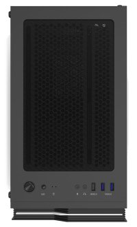 Konektory na horním panelu: 2× USB 3.0, 1× USB 2.0, 1× sluchátkový výstup, 1× vstup pro mikrofon