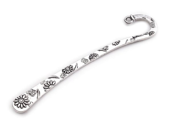 [Kovový polotovar určený k výrobě záložky do knihy. Je zcela na vás, jak si záložku dotvoříte. Na závěsné očko můžete připevnit řetízek s naketlovanými korálky, přívěsky s fimo hmoty, kovu či dřeva. Nebo můžete přivázat kousek stužky nebo bavlnky. Záleží zcela na vaší fantazii a vkusu. Záložka je zdobená ornamenty květů a motýlů, má lehce prohnutý tvar a kulatý háček, který můžete zavěsit za okraj knihy. Zdobení je oboustranné.]