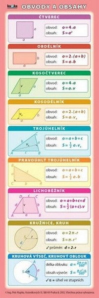 Praktická záložka obsahuje všechny důležité vzorce pro výpočet obvodů a obsahů obrazců a povrchů a objemů těles včetně názorných geometrických nákresů.