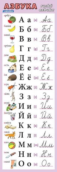Praktická záložka obsahuje tiskací a psací písmena ruské abecedy včetně výslovnosti a názorného obrázku.
