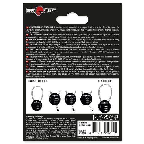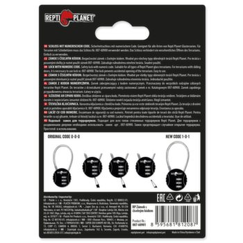 Bezpečnostní zámek s číselným kódem. Vhodné pro všechny typy skleněných terárií Repti Planet. Pro terária s posuvnými dvířky je nutné použít zámek 007-60900. Zabraňuje náhodnému otevření terária. Snadné použití.