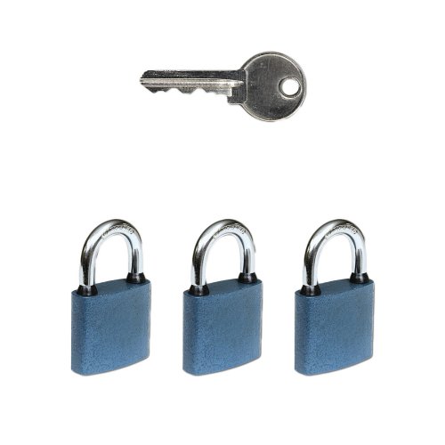 Set 3 ks visacích zámků na společný uzávěr – „SU“. Náhodný kód klíče. Klasický litinový zámek. Třmen HARDENED, jištěný ve dvou bodech. Gumové kroužky chránící litinové těleso proti průniku vody. Zamykání bez klíče - zatlačením třmenu. Vložka zámku s 5 odpruženými stavítky.