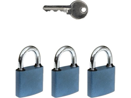 Set 3 ks visacích zámků na společný uzávěr – „SU“. Náhodný kód klíče. Klasický litinový zámek. Třmen HARDENED, jištěný ve dvou bodech. Gumové kroužky chránící litinové těleso proti průniku vody. Zamykání bez klíče - zatlačením třmenu. Vložka zámku s 5 odpruženými stavítky.