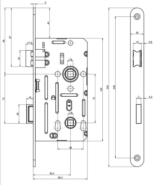 rozteč 72 mm, zádlab 80 mm, backset 55 mm, šířka čela 20 mm