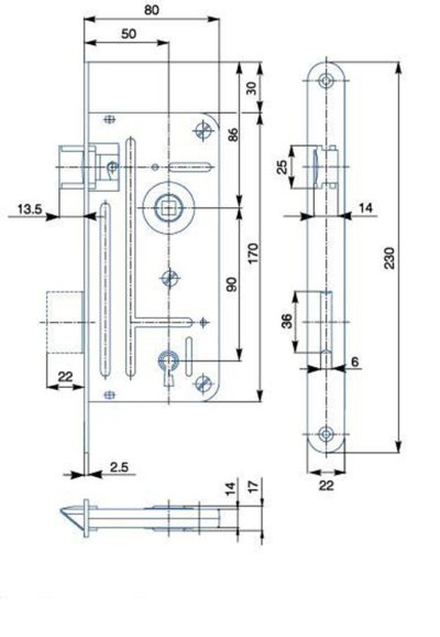 Zadlabací dozický zámek 548A dvouzápadový s převodem bez otvory pro dělené štíty je univerzální na pravé i levé dveře.