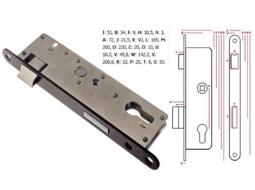 Mezipokojový zadlabací zámek s blokací střelky je bez převodu (střelka ovládaná pouze klikou) a s otvory pro dělené štítky.