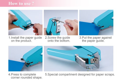 Ruční kleště pro zaoblování rohů s kapacitou až 10 listů a poloměrem zaoblení 5 mm. Kleště jsou vybaveny zásobníkem na ustřižené růžky, díky kterému nemusíte ustřižené růžky sbírat po stole nebo na podlaze.