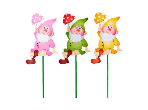 Dekorativní dřevěný zápich s motivem skřítka o velikosti 50 mm, doplněný dřevěnou špejlí. Provedení je dodáváno v barevném mixu, jednotlivé kusy se mohou lišit odstínem nebo detailem motivu.