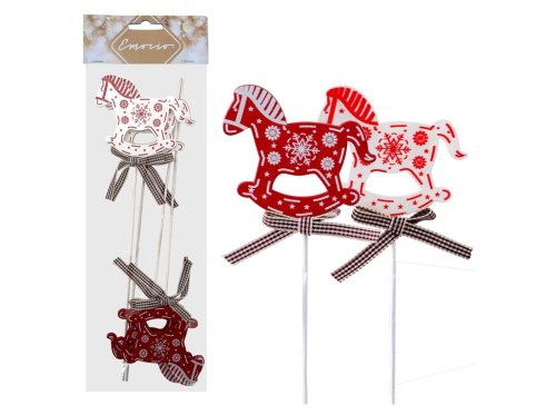 Dekorativní dřevěný zápich s motivem houpacího koníka v tradiční červené a bílé barvě. Samotný motiv má velikost 80×65 mm a je upevněn na špejli pro snadné zapíchnutí do květináčů, vánočních aranží, věnců či dekorativních košíků.