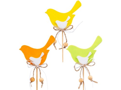 Dekorativní dřevěný zápich s motivem ptáčka o velikosti 80×70 mm, doplněný dřevěnou špejlí. Barevné provedení je dodáváno v mixu, jednotlivé kusy se mohou lišit odstínem nebo detailem zpracování.
