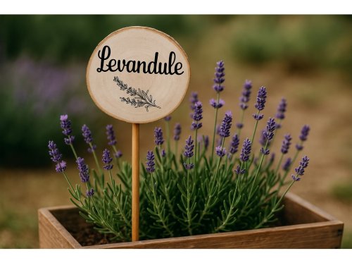 Dřevěný zápich s nápisem „levandule“ pro označení bylinek v květináči nebo na záhoně.