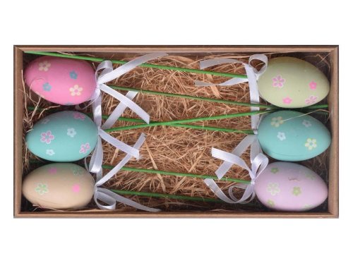 Sada velikonočních zápichů obsahuje 6 plastových kraslic o velikosti 60 mm, zdobených jemným motivem kytiček. Každá kraslice je upevněna na dřevěné špejli, díky čemuž jsou ideální pro zdobení květináčů, jarních aranžmá, osení nebo věnců. Baleno v praktické krabičce, vhodné také jako dárek. Mix barev dodá výzdobě veselý jarní vzhled. Zboží je dodáváno v mixu. Doručované zboží je vybíráno náhodně a nelze vybrat konkrétní provedení.