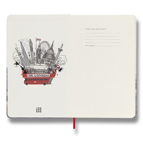 Pevná, ve hřbetu šitá vazba v kartonových deskách obepnutých pružnou páskou proti samovolnému otevírání. Titulní strana s Tower Bridge a na zadní straně dvoupatrový autobus,, neodmyslitelná součást Londýna. Zápisník obsahuje také pohlednici s motivem volá Londýn. Zápisník je vybaven kapsou na vizitky a drobnosti, která je vyrobena z tkaniny a kartonu,, textilní záložkou a letákem s historií MOLESKINE. Gramáž papíru 100 g/m², neobsahuje kyseliny., Rozměry 13 x 21 cm, 120 listů, linkovaný., VELIKOSTI TEMATICKÝCH ZÁPISNÍKŮ:, * S - 9 x 14 cm (A6), * L - 13 x 21 cm (A5), Příběh značky MOLESKINE se začal psát již v 19. století ve Francii, kdy vznikl produkt s velkou tradicí. Zápisníky MOLESKINE si oblíbili významní umělci a myslitelé jako Vincent van, Gogh, Pablo Picasso či Ernest Hemingway. Dnes je značka Moleskine synonymem pro kulturu, cestování, kreativitu a osobní identitu, a to jak v reálném světě, tak i ve světě digitálním., MOLESKINE je kreativním a nápaditým partnerem pro dnešní dobu.,
