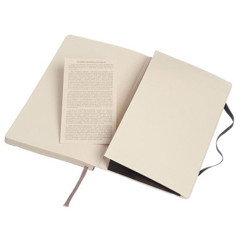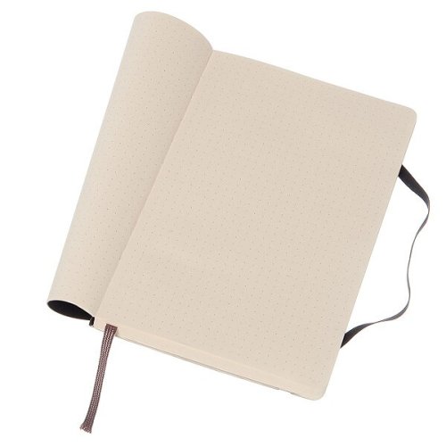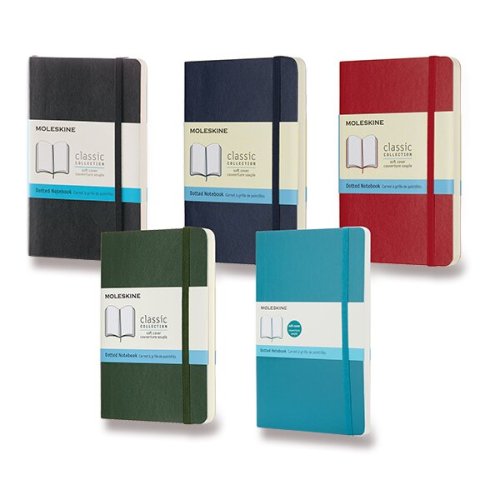 Zápisník s měkkou, ve hřbetu šitou vazbou v kartonových deskách, obepnutý pružnou páskou proti samovolnému otevírání. Zápisník je vybaven pořadačem poznámek, který je vyroben z tkaniny a kartonu, textilní záložkou a letákem s historií MOLESKINE. Gramáž papíru 70 g/m2, neobsahuje kyseliny. Rozměr: 9 x 14 cm, 96 listů, tečkovaný
