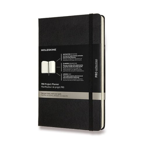 Novinka professional zápisník projektový. Tento originální nedatovaný zápisník je určený opravdovým profesionálům, neboť spojuje výhody diáře s výhodami zápisníku: doplňte dny a data, jak uznáte za vhodné, použijte tolik stran, kolik na konkrétní den zrovna potřebujete! Tento černý projektový zápisník má pevnou, ve hřbetu šitou vazbu v kartonových deskách. Obepíná ho pružná páska proti samovolnému otevírání. Zápisník je rozdělen do tří hlavních sekcí, z nichž káždá je věnována konkretnímu účelu - inspirace, plánování a protokolování, dále obsahuje nedatované plánovací sekce, s ročními, 4měsíčními, měsíčními a týdenními přehledy. Pro snadnou orientaci jsou stránky číslované, poslední stránky číslované nejsou a lze je lehce vytrhnout. Součástí zápisníky jsou samolepky, praktická vnitřní kapsa, která je vyrobena z tkaniny a kartonu, a leták s historií Moleskine. Papír s gramáží 70 g/m2 neobsahuje kyseliny.