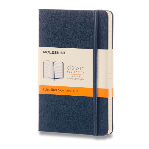 Moleskine brings more color to its notebooks. This Sapphire Blue version of the classic Ruled Pocket Notebook is perfect for writings, thoughts and passing notes. The color-coded bands reveal the notebook's layout. The back of the paper banderole can be saved for later use. The ribbon, bookmark and expandable inner pocket match the cover color. Specifications: - Layout: Ruled Paper- Dimensions: 3-1/2 x 5-1/2- Hard Cover with elastic closure and bookmark ribbon.- Color: Sapphire Blue- Pages: 192- Expandable Inner-Pocket- Paper Weight: 70 gsm/47 lb.; FSC Certified Paper; Acid-Free (pH Neutral)