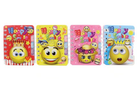 Barevný zápisník s motivem smajlíků. Rozměry 9,5x12x0,5 cm. Uvnitř barevné linkované listy. Baleno v sáčku. Více druhů - dodáváme dle skladové dostupnosti. Výrobek není hračka.