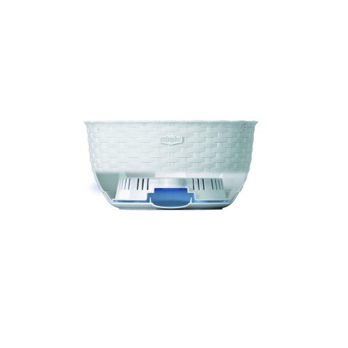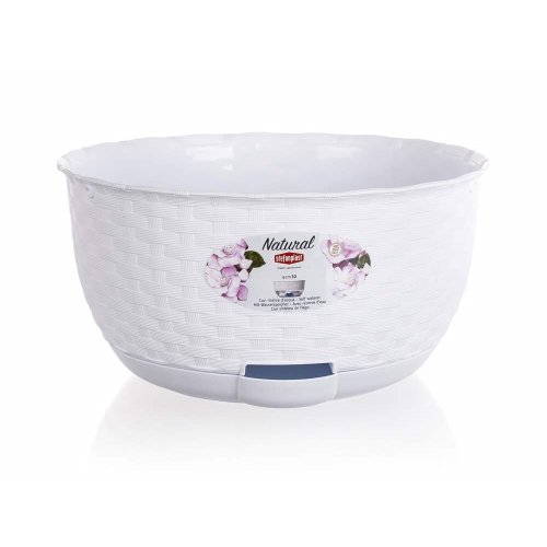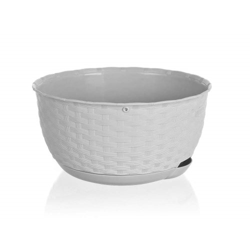 Plastová samozavlažovací žardinka věrně imituje rattanový výplet. Barva: bílá. Šířka: 30 cm, výška: 15 cm, hloubka: 30 cm.