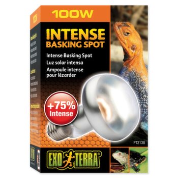 ExoTerra Intense Basking Spot je žárovka vyzařující bodové světlo určená speciálně pro vyhřívání pouštních a tropických druhů plazů. Teplo a světlo v paprsku jsou díky reflektorové vrstvě zvýšeny o 75 %. Bodový zdroj zachovává v teráriu teplotní gradient, který je pro plazy nesmírně důležitý. Kužel tepla směřuje do jednoho místa, takže nedochází ke zbytečným ztrátám. Když se chce zvíře ohřát, vleze si přímo pod žárovku, kde je poměrně vysoká teplota, a až se bude chtít ochladit, najde si v teráriu chladnější místo. Žárovka slouží pouze jako zdroj tepla a viditelného světla. Nevyzařuje UVB paprsky, které jsou pro většinu plazů nezbytné. Je proto nutné do terária přidat zdroj UVB paprsků použitím buď klasické lineární, nebo kompaktní zářivky. Případně lze použít vysokotlakou výbojku, která vyzařuje teplo, světlo i UV paprsky zároveň. Vhodné pro: vodní a suchozemské želvy, leguány, agamu vousatou, chameleony a gekony. Výkon: 100 W