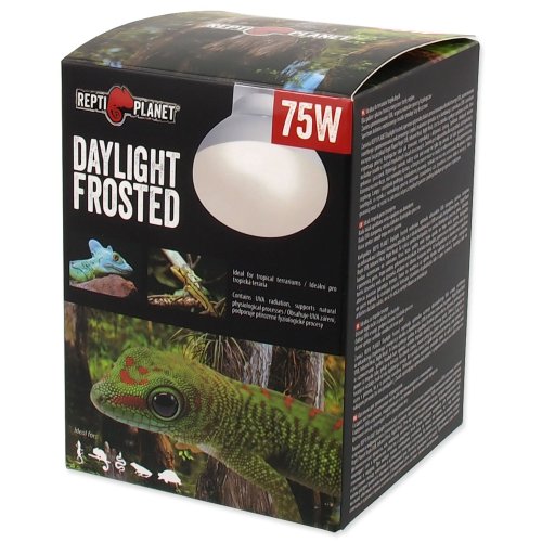 Žárovka REPTI PLANET Daylight Frosted poskytuje optimální poměr ultrafialového UVA záření, světelného záření a infračerveného (tepelného) záření a je ideální v kombinaci s UVB a nočními žárovkami (např. Repti Planet Repti UVB, Infrared Heat, Night Heat). Jedná se o širokospektrální žárovku, která podporuje fyziologické procesy jako je např. aktivita, příjem potravy a rozmnožování. Studené barevné spektrum imituje světlo v tropických oblastech a deštných pralesích. Žárovka je vhodná např. pro tropické žáby, gekony a ještěry.