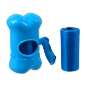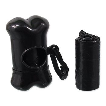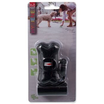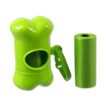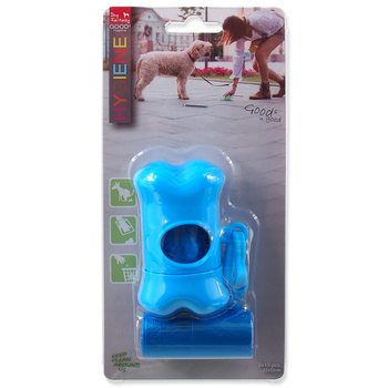 Plastový zásobník s úchytem na vodítko ve tvaru kosti + 2 role sáčků na výkaly.