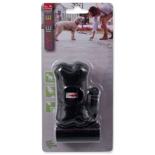 Plastový zásobník na sáčky na psí exkrementy se dvěma rolemi v balení.