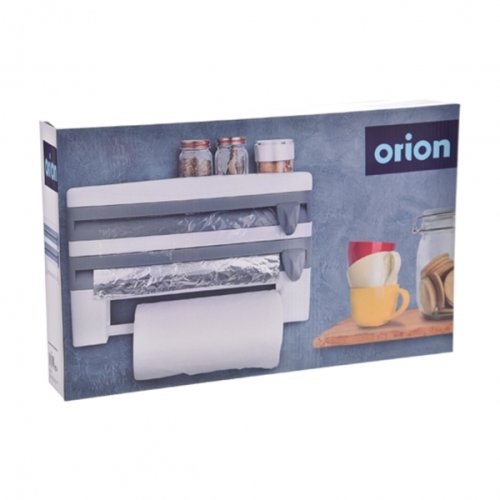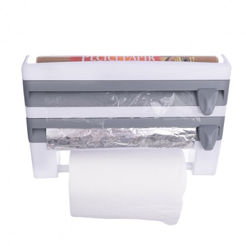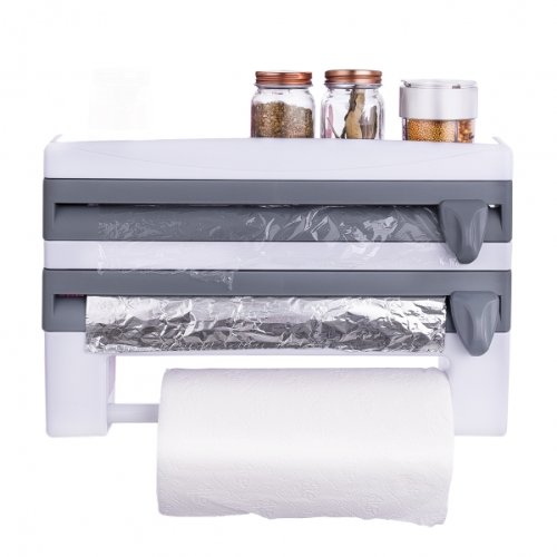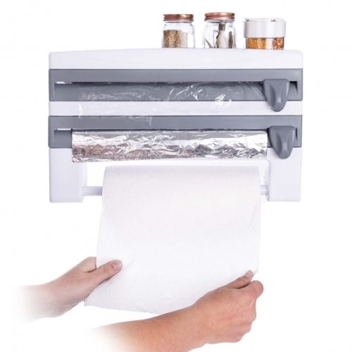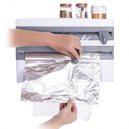 Zásobník do kuchyně na potravinovou fólii, alobal a papírové utěrky zajistí, že budete mít tyto pomocníky vždy při ruce. Do horní přihrádky můžete umístit pečící papír, kořenky, odložit kuchyňskou minutku… Fólii a alobal pohodlně odříznete. Pro fólii je určen kovový nůž, fólie musí být při řezání napnutá. Pro alobal je určen plastový nůž. Materiál plast, kov. Rozměry 38 x 8 x 25 cm. Lze připevnit buď na šroubky nebo nalepit na odmaštěný hladký povrch (montážní materiál součástí). EAN 8592381161224