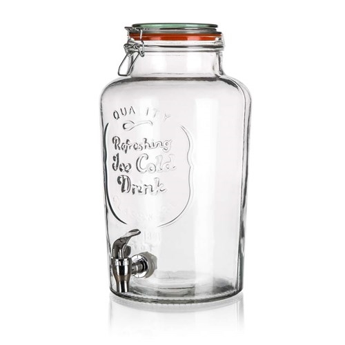 Skleněný zásobník na nápoje BRISA o objemu 7 l slouží k servírování osvěžujících nápojů na oslavách a letních párty. Zásobník je vyroben z kvalitního čirého skla a je opatřen praktickým plastovým kohoutkem pro dávkování nápojů. Zásobník je určený k podávání pouze chladných a svěžích letních nápojů typu domácí limonáda, ovocný džus, ledový čaj a podobně. Široké hrdlo umožňuje do nádoby pohodlně vkládat led nebo kousky ovoce. Víčko na patentní uzávěr. Průměr 20 a výška 35 cm. Materiál sklo / kov / plast. Není vhodné do myčky nádobí. EAN 8591022499856