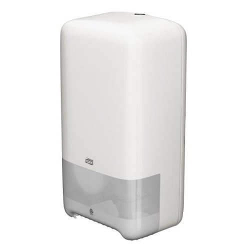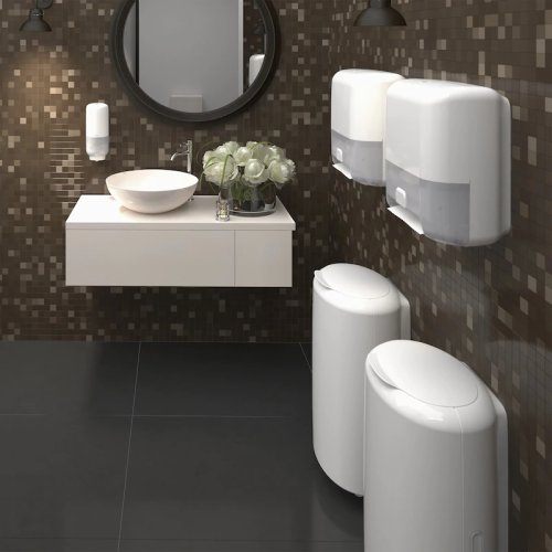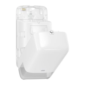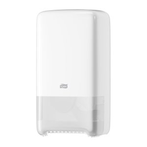 Zásobník Tork Twin-Box T6 v bílé barvě je určen na dvě kompaktní role toaletního papíru s délkou 100 m.
