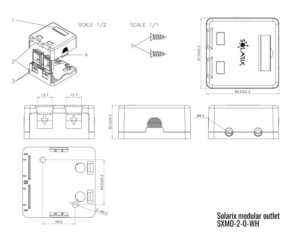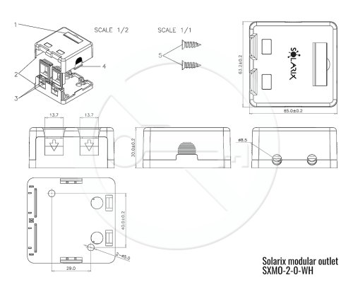 Vlastnosti *Modulární zásuvka: Pro keystony 2 × RJ45 *Kompatibilita: Se všemi keystony Solarix řady -SA a -NA *Instalace: Velmi jednoduchá a rychlá montáž na omítku *Ochrana portů: Port je chráněn protiprachovou krytkou *Kabelový vývod: Pro kabely o průměru do 8,5 mm, umístěn na horní straně zásuvky *Příslušenství: Součástí balení jsou moduly k barevnému odlišení portů v červené a modré barvě *Označení: Na zásuvce je vyměnitelný označovací štítek *Barva: Bílá